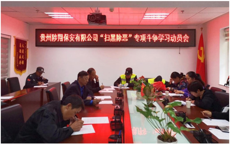 2019 年 4 月 8 日,貴州陟翔保安有限公司召集各區(qū)域經(jīng)理、項(xiàng)目經(jīng)理、項(xiàng)目隊(duì)長(zhǎng)在公司會(huì)議室召開了“掃黑除惡” 專項(xiàng)斗爭(zhēng)學(xué)習(xí)動(dòng)員大會(huì)。會(huì)議由公司總經(jīng)理陳春生主持,會(huì)上傳達(dá)學(xué)習(xí)了貴陽(yáng)市公安局治安支隊(duì)保安服務(wù)管理大隊(duì)下發(fā)的《關(guān)于保安服務(wù)行業(yè)積極協(xié)助公安機(jī)關(guān)開展掃黑除惡專項(xiàng)斗爭(zhēng)和加強(qiáng)隊(duì)伍建設(shè)工作的通知》及《掃黑除惡應(yīng)知應(yīng)會(huì)》 知識(shí),并就貫徹落實(shí)《通知》精神作周密的部署:一是要確實(shí)學(xué)懂弄通掃黑除惡專項(xiàng)斗爭(zhēng)的重大意義,從思想上高度重視;二是熟悉《掃黑除惡應(yīng)知應(yīng)會(huì)》知識(shí),從行動(dòng)上積極主動(dòng)配合公安機(jī)關(guān)行動(dòng);三是認(rèn)真仔細(xì)開展排查清理保安員隊(duì)伍,對(duì)不適宜從事保安工作的人員迅速作清退處理,保持隊(duì)伍的純潔性;四是要將《通知》精神傳達(dá)到每個(gè)隊(duì)員,密切關(guān)注在職隊(duì)員的現(xiàn)實(shí)表現(xiàn),進(jìn)行動(dòng)態(tài)管理,加強(qiáng)思想教育,及時(shí)制止不良苗頭;五是要規(guī)范隊(duì)員入職政審工作,嚴(yán)格按《保安服務(wù)管理?xiàng)l例》規(guī)定辦理入職手續(xù)。