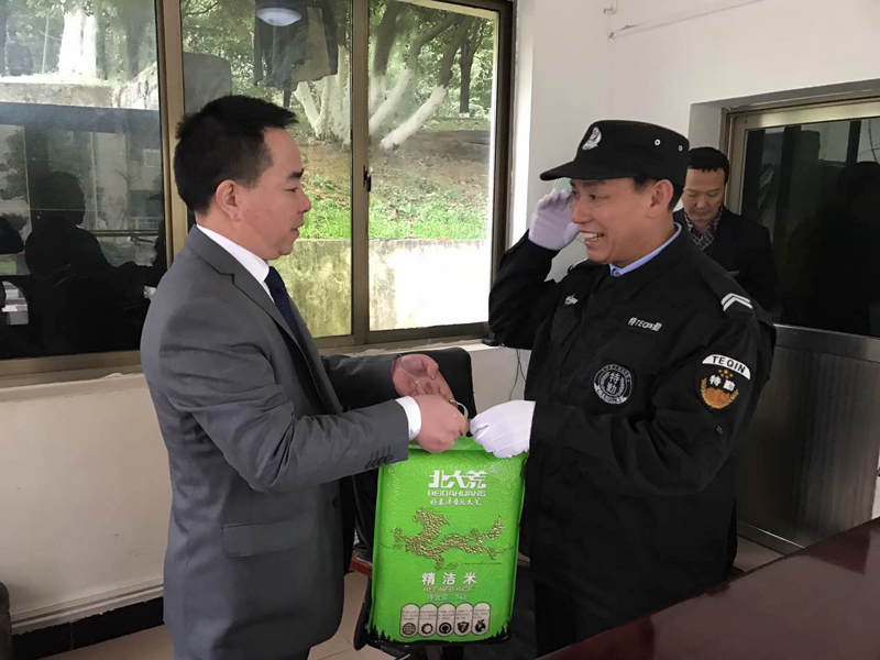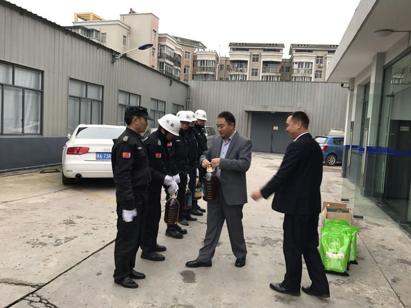(陟翔集團股東代表王訓(xùn)江和保安大隊長袁貴軍為各點保安員送上慰問品)